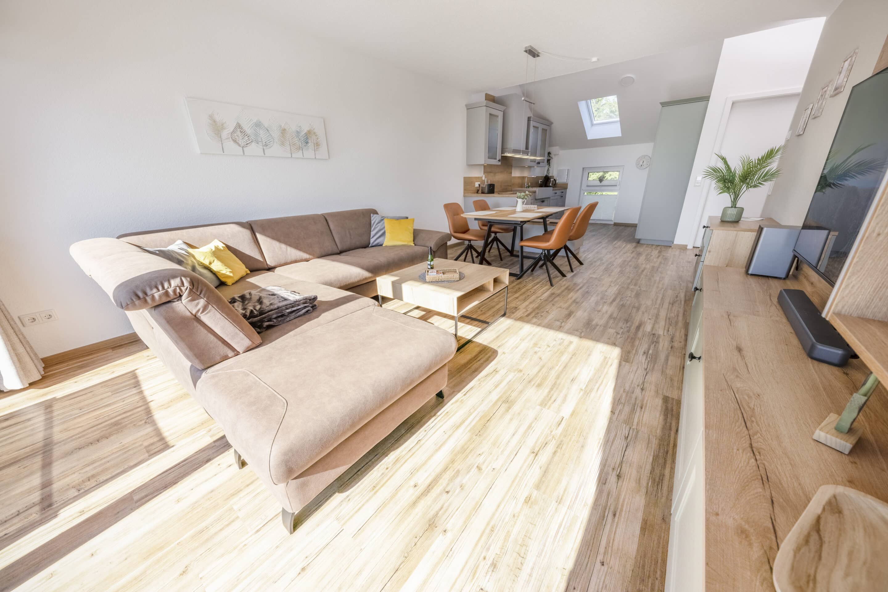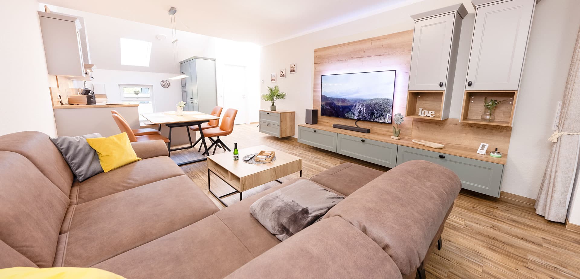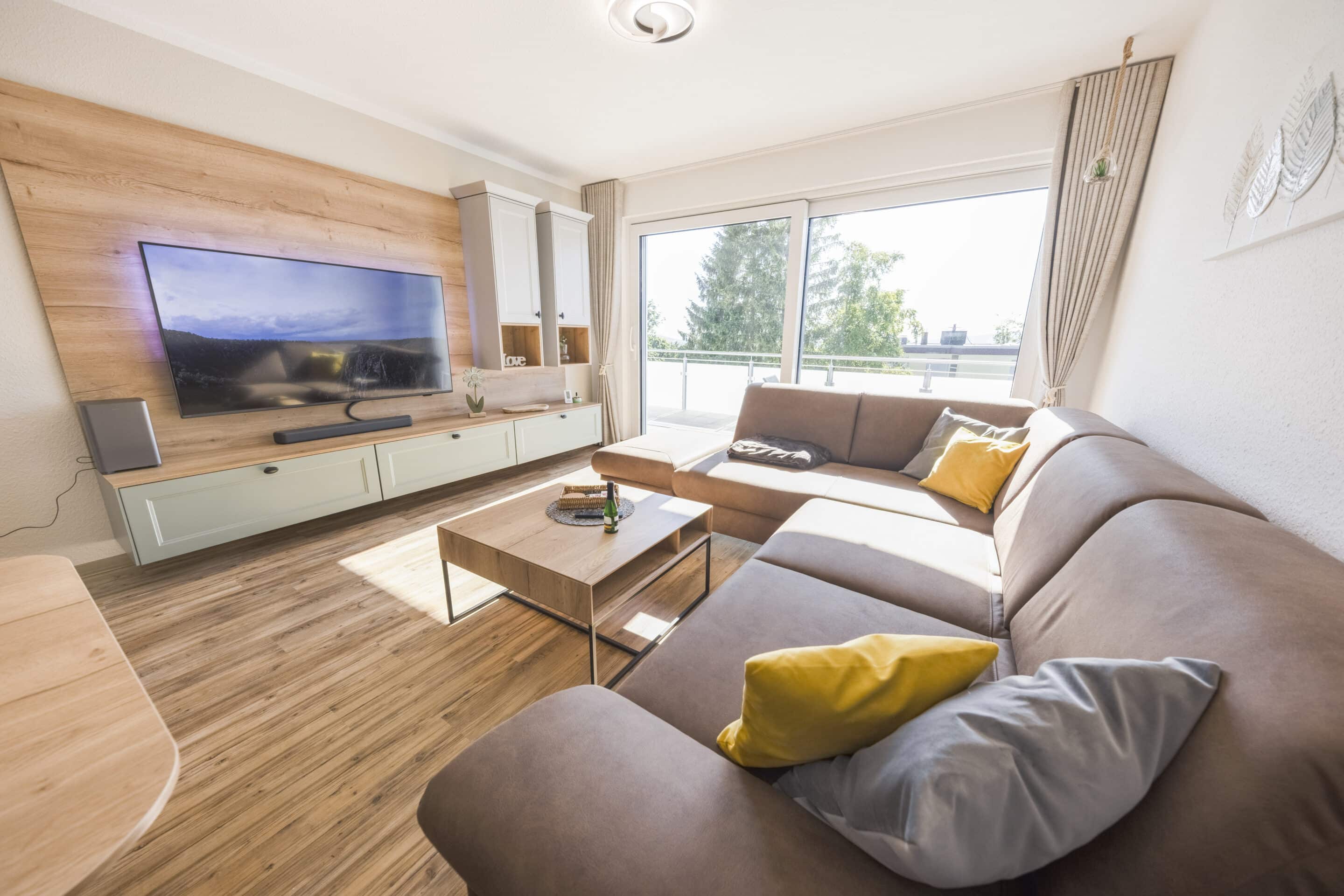 Im Wohnzimmer erwartet Sie ein bequemes Sofa mit Kopf- und Sitztiefenverstellung, eine großzügige Wohnwand sowie ein moderner 65-Zoll-Flachbild-TV mit Ambilight und Soundbar – ideal für entspannte Fernsehabende.