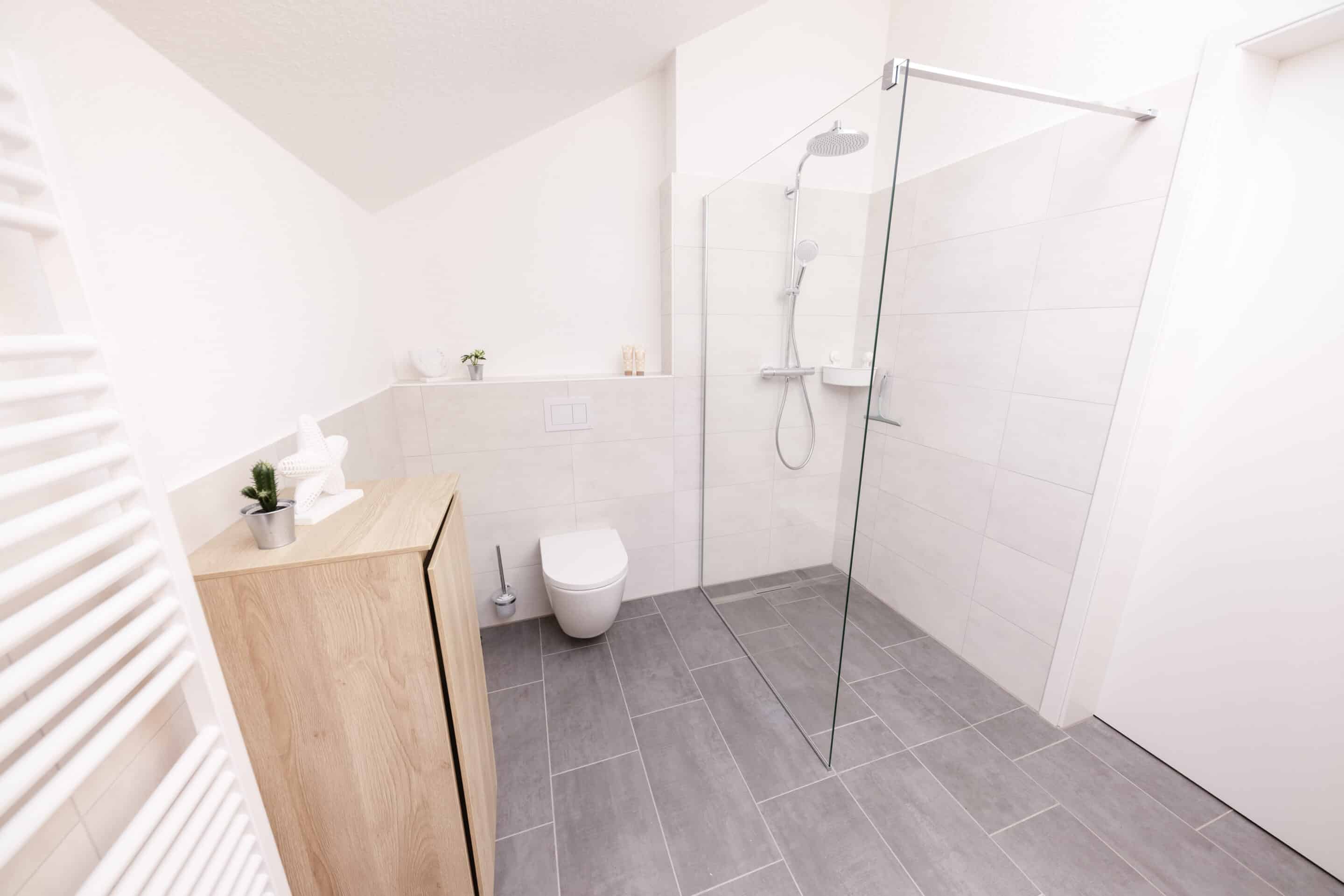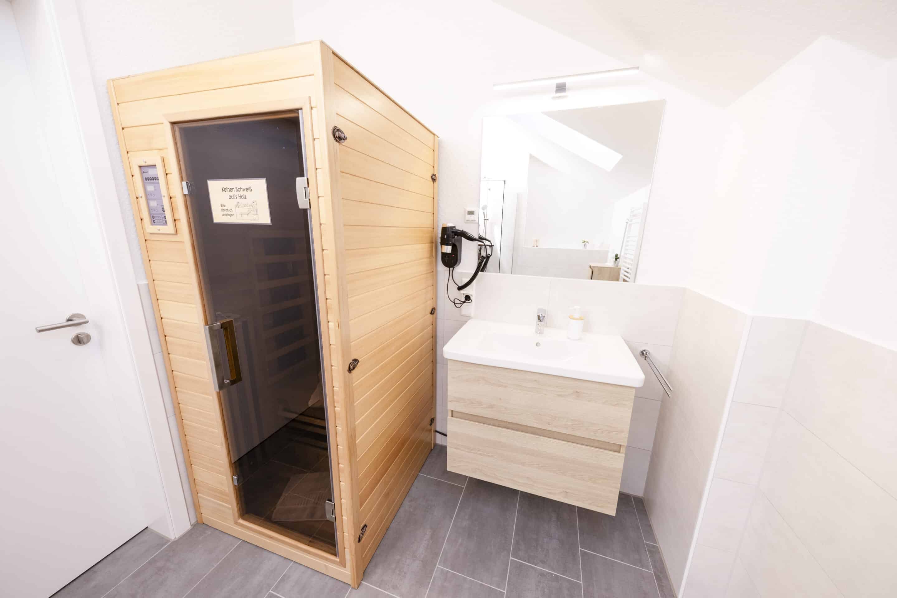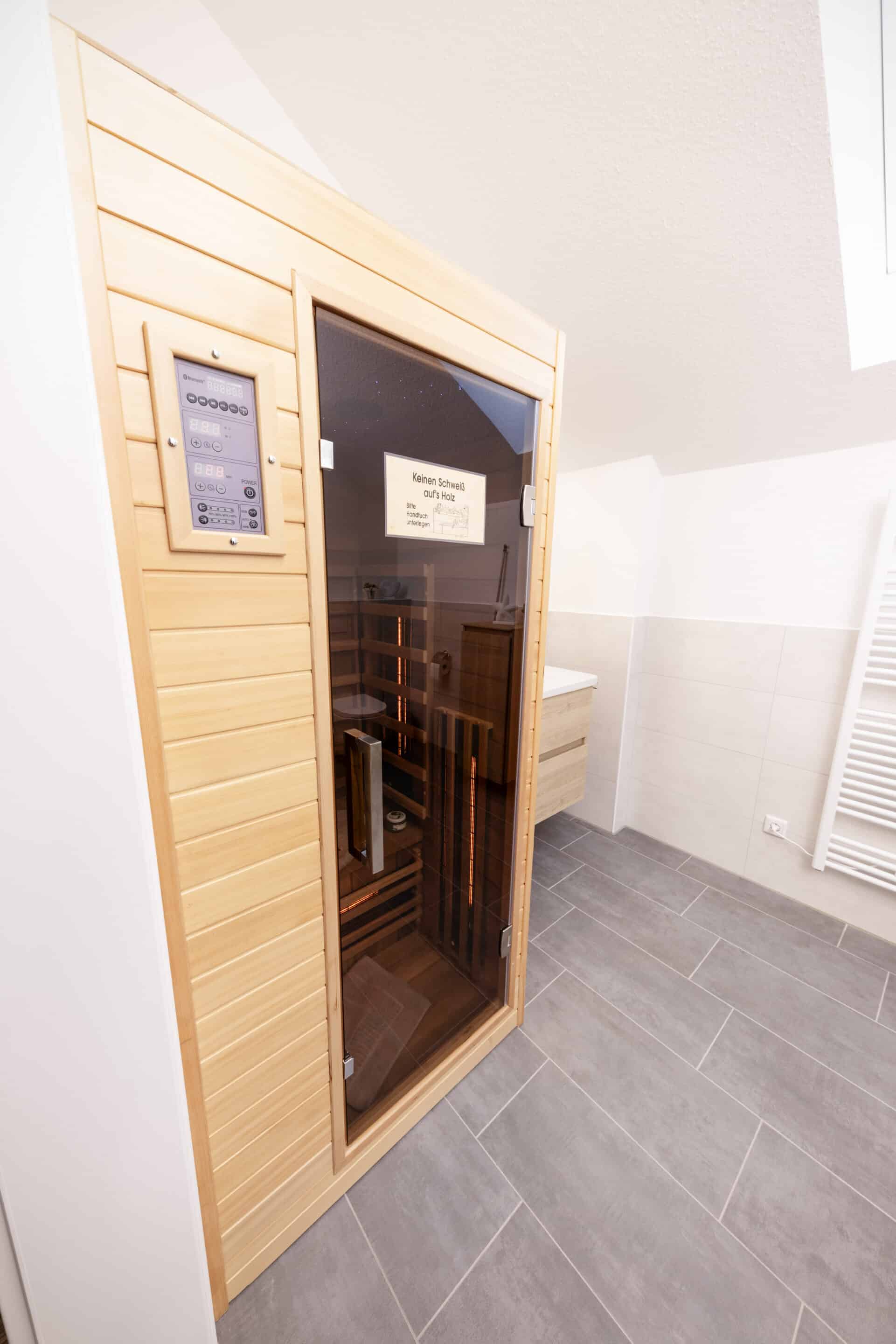 Das Badezimmer besticht durch eine ebenerdige Dusche, einen Waschtisch und ein WC. Besonders hervorzuheben ist die integrierte Infrarotsauna mit Sternenhimmel, die mit Musikfunktion und Zedernholz für entspannte Momente sorgt. Hier können Sie nach einem erlebnisreichen Tag wunderbar relaxen und neue Energie tanken.