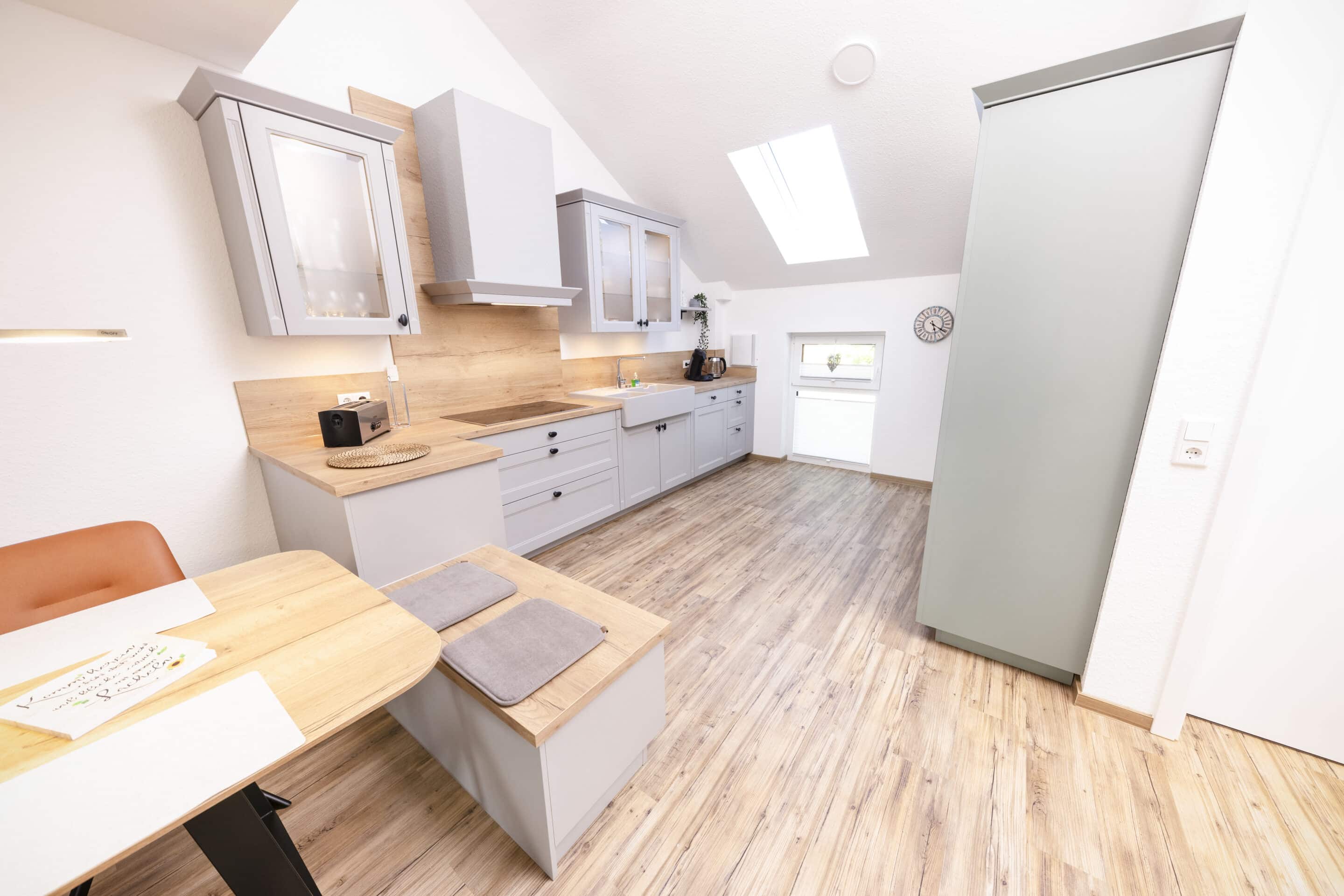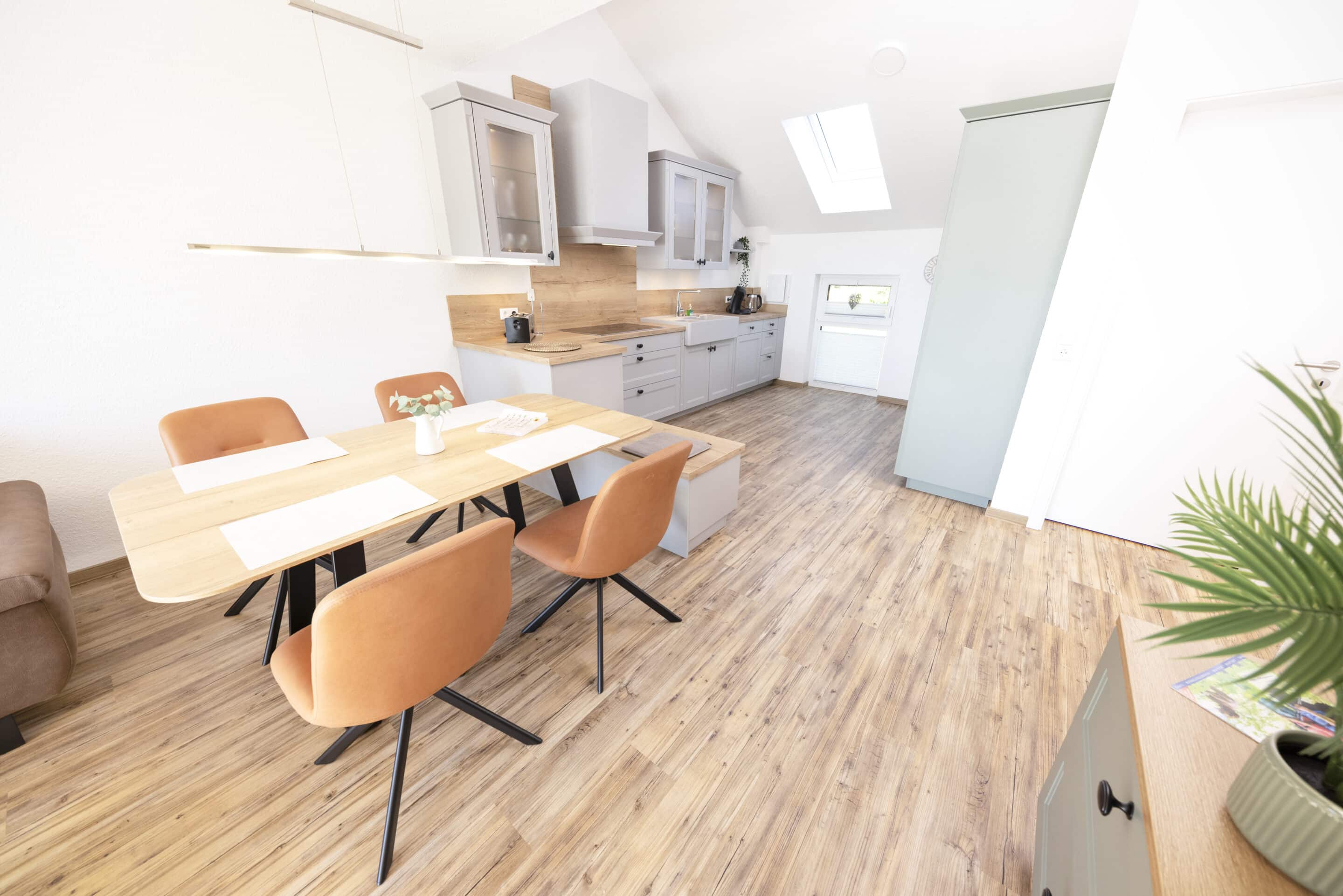 Der offene Wohn-, Ess- und Kochbereich lädt zum Verweilen ein. Die Landhausküche ist voll ausgestattet mit Kühlschrank, Backofen, Konvektomat und Geschirrspüler – so macht Kochen Spaß! Gemütliche beleuchtete Vitrinen schaffen eine angenehme Atmosphäre am Abend. Der Essbereich mit stilvollem Mobiliar, passend zur Gesamteinrichtung, bietet den perfekten Rahmen für gemeinsame Mahlzeiten, schöne Gespräche oder nette Spieleabende.
