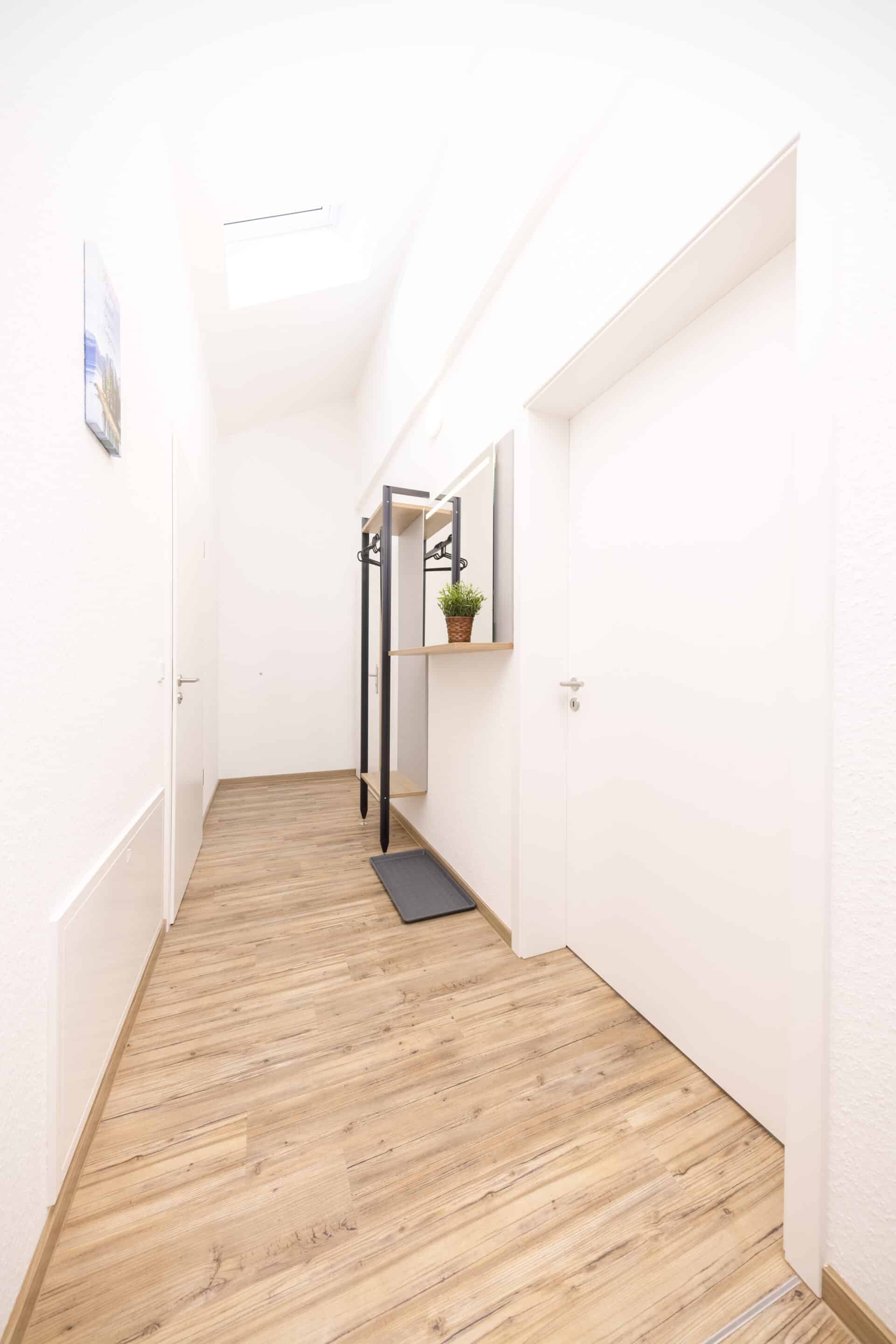 Dieses stilvolle Domizil erstreckt sich über großzügige 77 Quadratmeter und vereint Komfort, Helligkeit und eine warme Atmosphäre. Bereits beim Betreten werden Sie von einer hellen und eleganten Diele empfangen, die durch viel Tageslicht erstrahlt. Hier finden Sie einen praktischen Garderobenständer, der genügend Platz für Ihre Jacken bietet, sodass Sie stets ordentlich und bequem ankommen.
