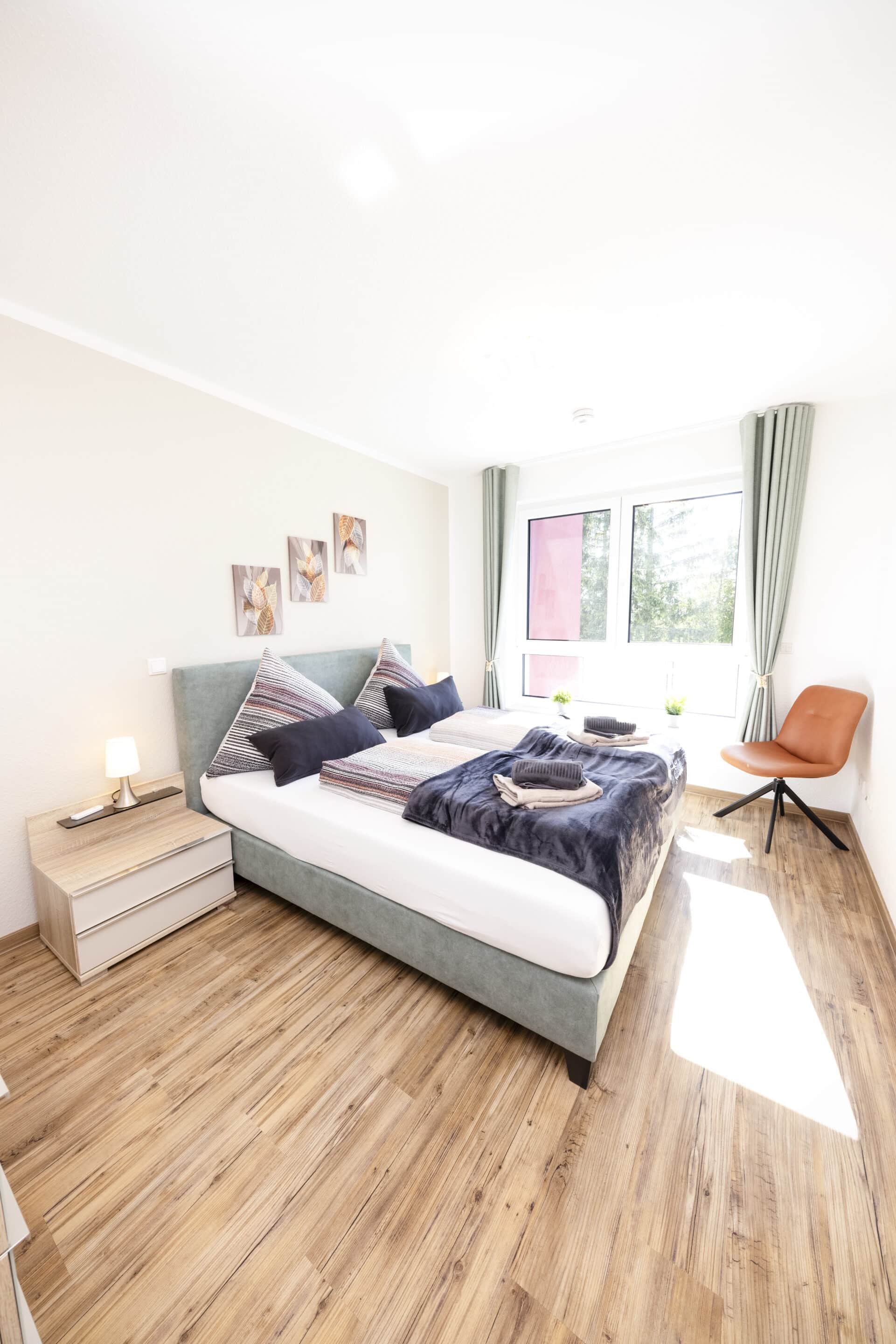 Das Schlafzimmer ist ein Ort der Ruhe und Erholung. Es ist mit einem modernen, komfortablen Boxspringbett ausgestattet, das für erholsame Nächte sorgt. Ergänzt wird der Raum durch seine stilvolle Einrichtung mit Nachtschränken, einer geräumige Kommode mit großem Spiegel sowie eine liebevoll gestaltete Ankleide mit einem großzügigen Schrank, der über einen integrierten Safe und einen weiteren Spiegel verfügt – perfekt, um sich stilvoll und bequem für den Tag vorzubereiten. Die angebrachten Insektenschutzgitter sorgen für einen ruhigen Schlaf.