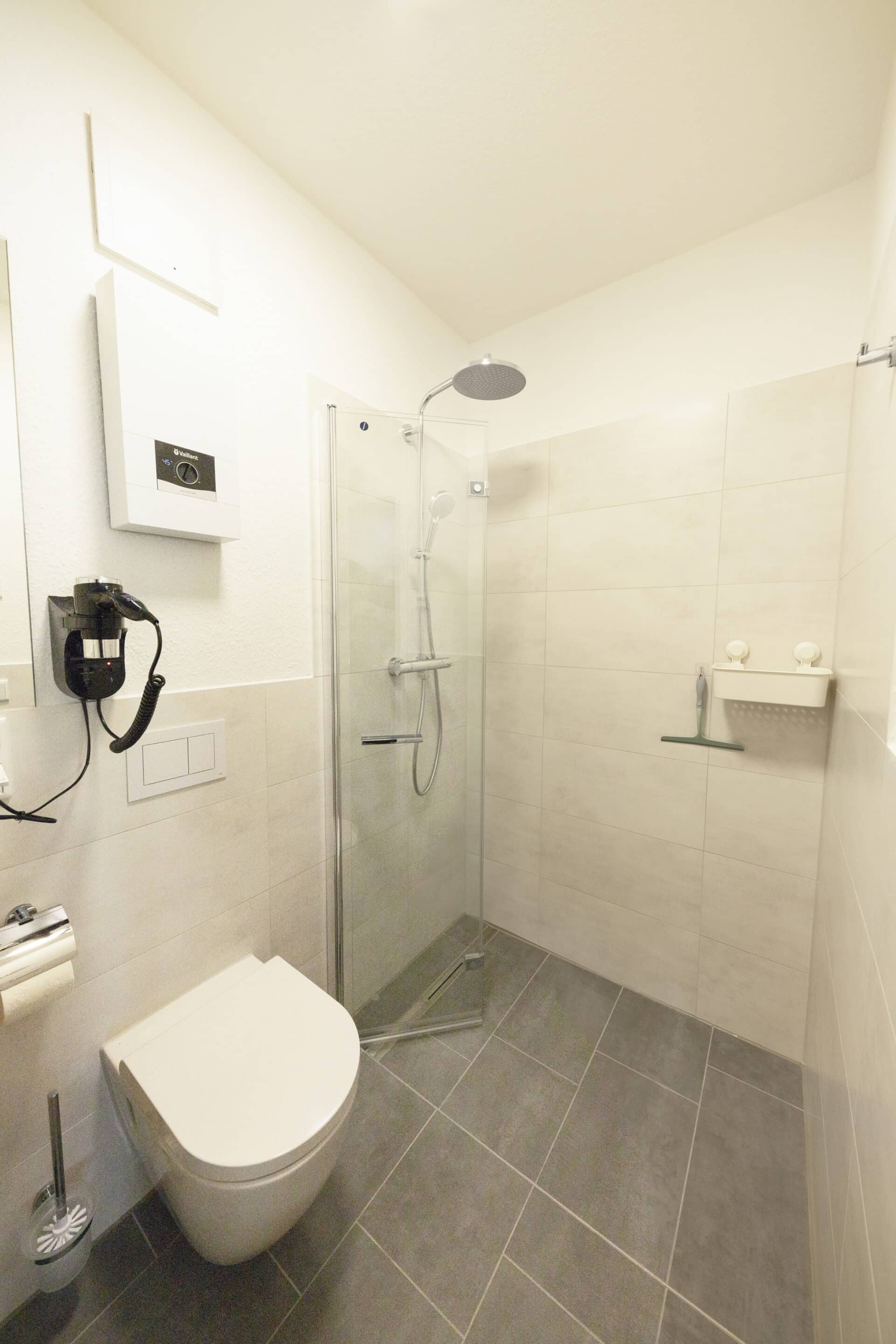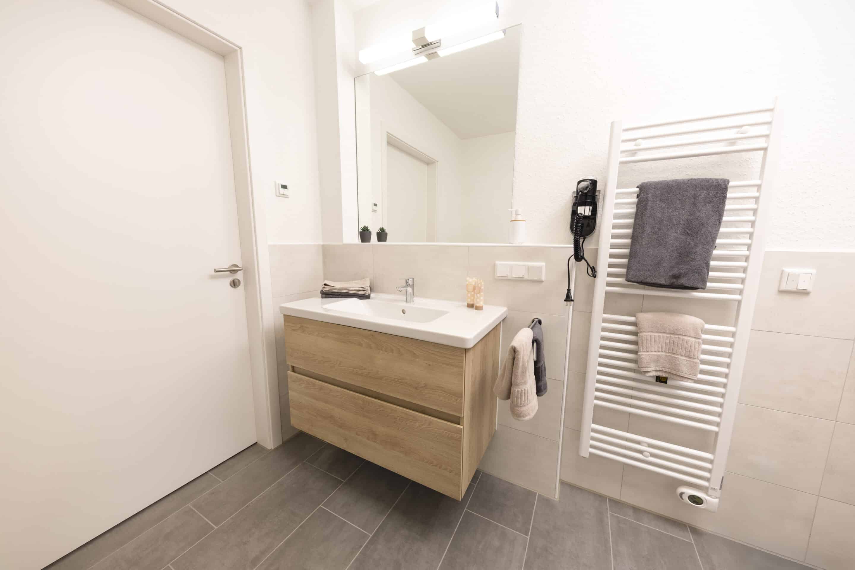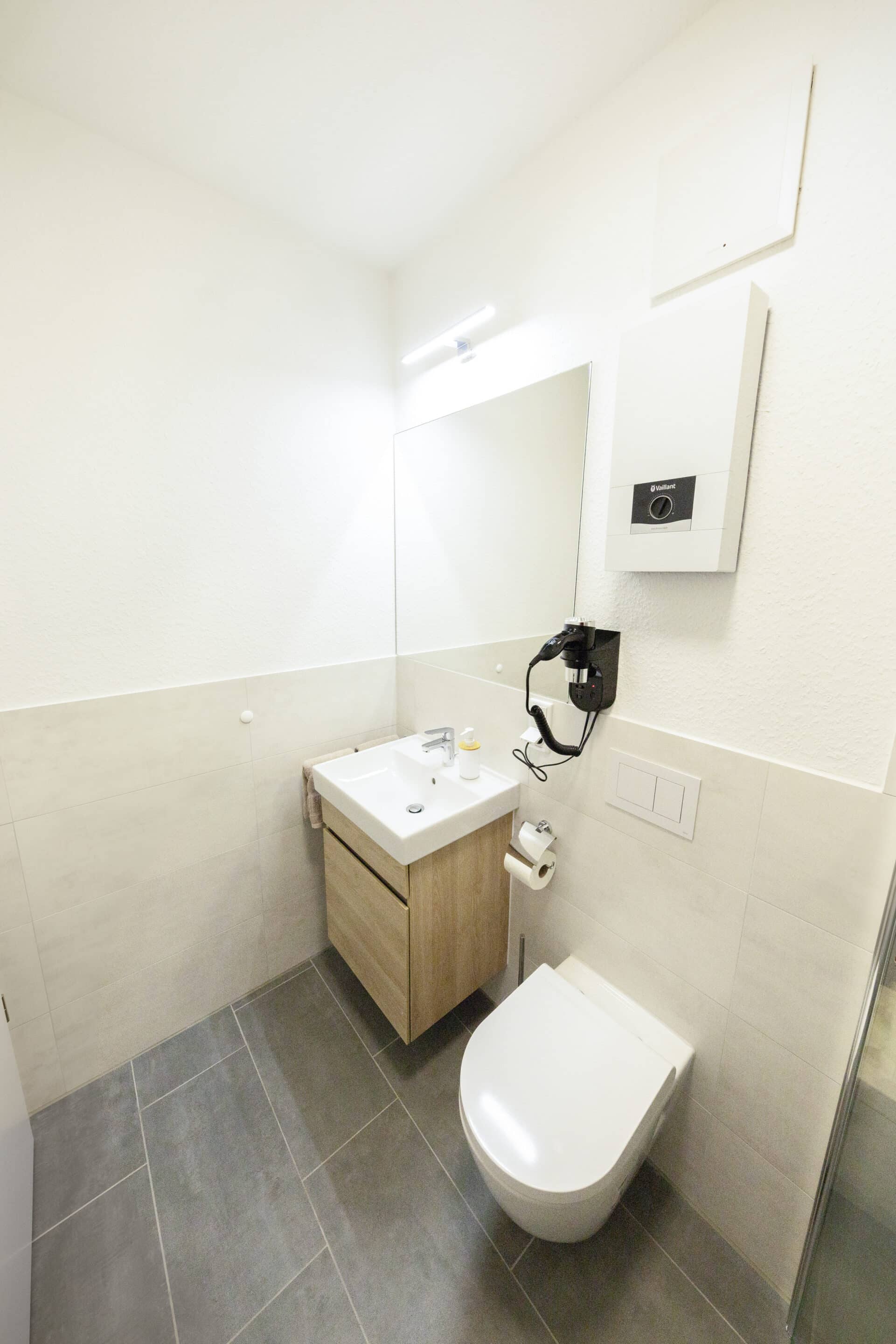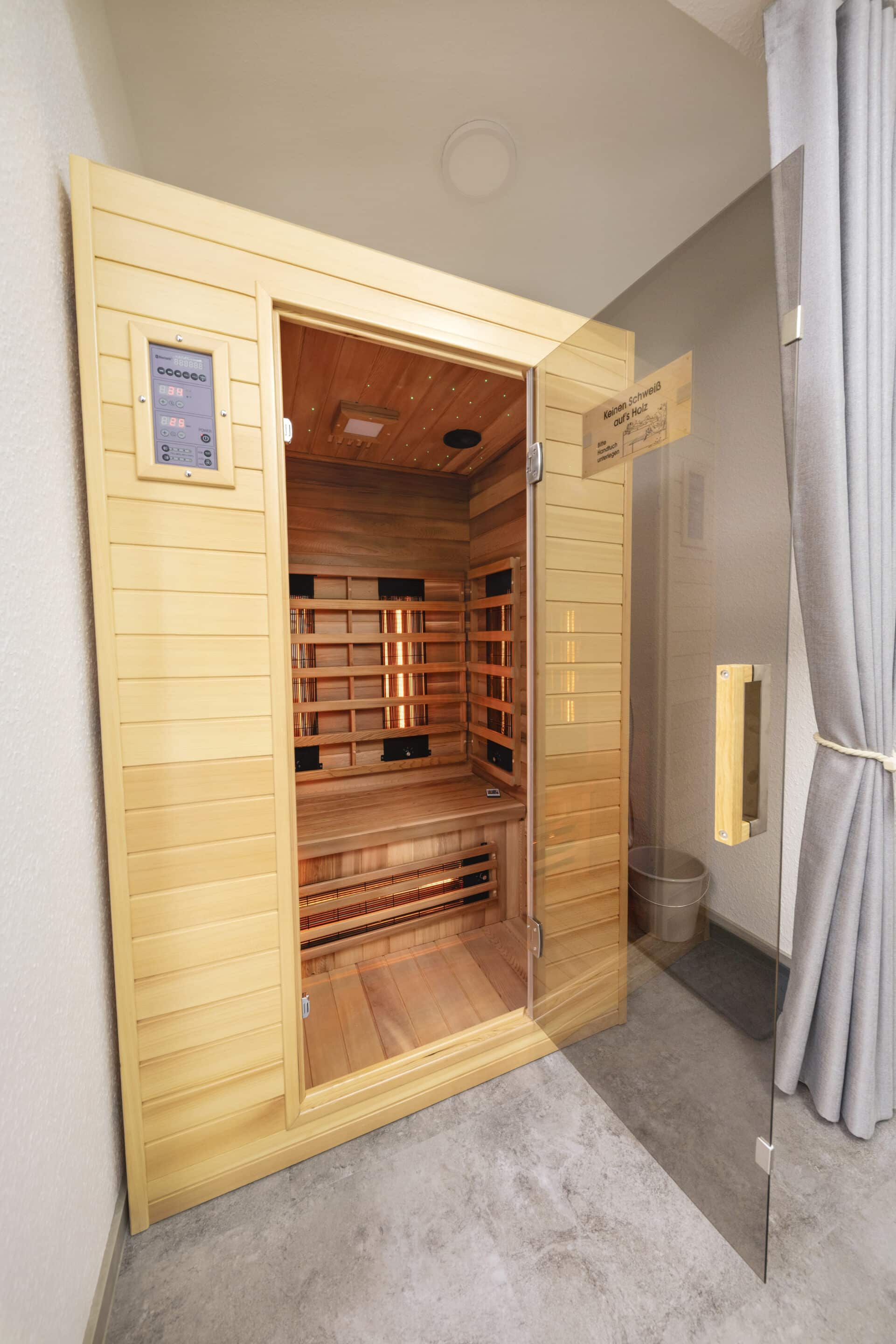 Entspannen Sie nach einem ereignisreichen Tag in der Infrarot-Sauna. Die Infrarotsauna bietet Ihnen Platz und eine stilvolle Atmosphäre für zwei Personen. Das modern gestaltete Bad ist mit einer Dusche ausgestattet und rundet das Angebot ab. Zusätzlich verfügt das Appartment über ein Gäste-WC mit einer weiteren Dusche.