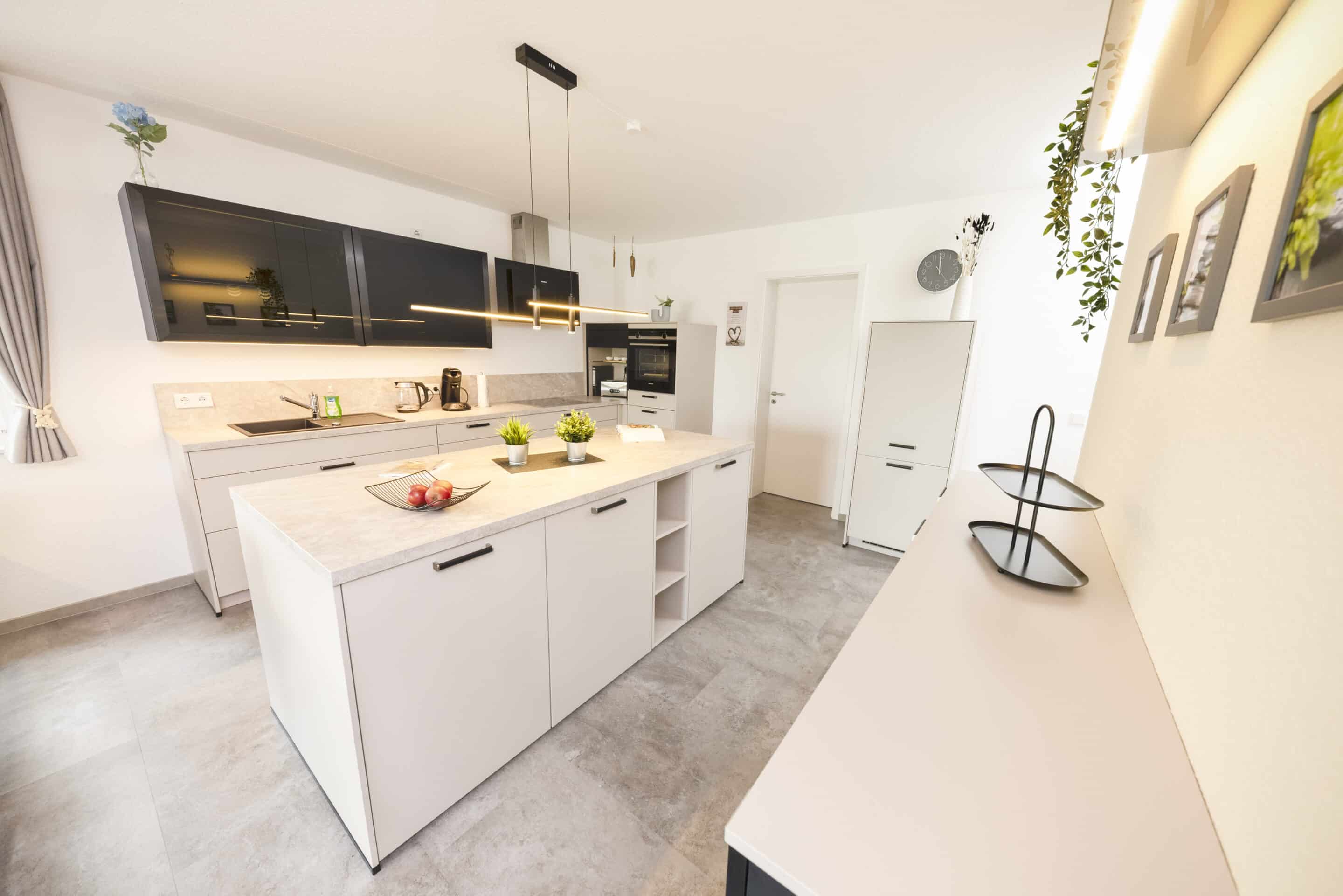 Die mittig platzierte Schrankinsel bietet nicht nur zusätzlichen Stauraum, sondern dient auch als einladender Treffpunkt für Familie und Freunde. Der beleuchtete Wandschrank setzt stilvolle Akzente und sorgt für eine angenehme Atmosphäre, während er gleichzeitig die Küchenutensilien und das Geschirr perfekt in Szene setzt.