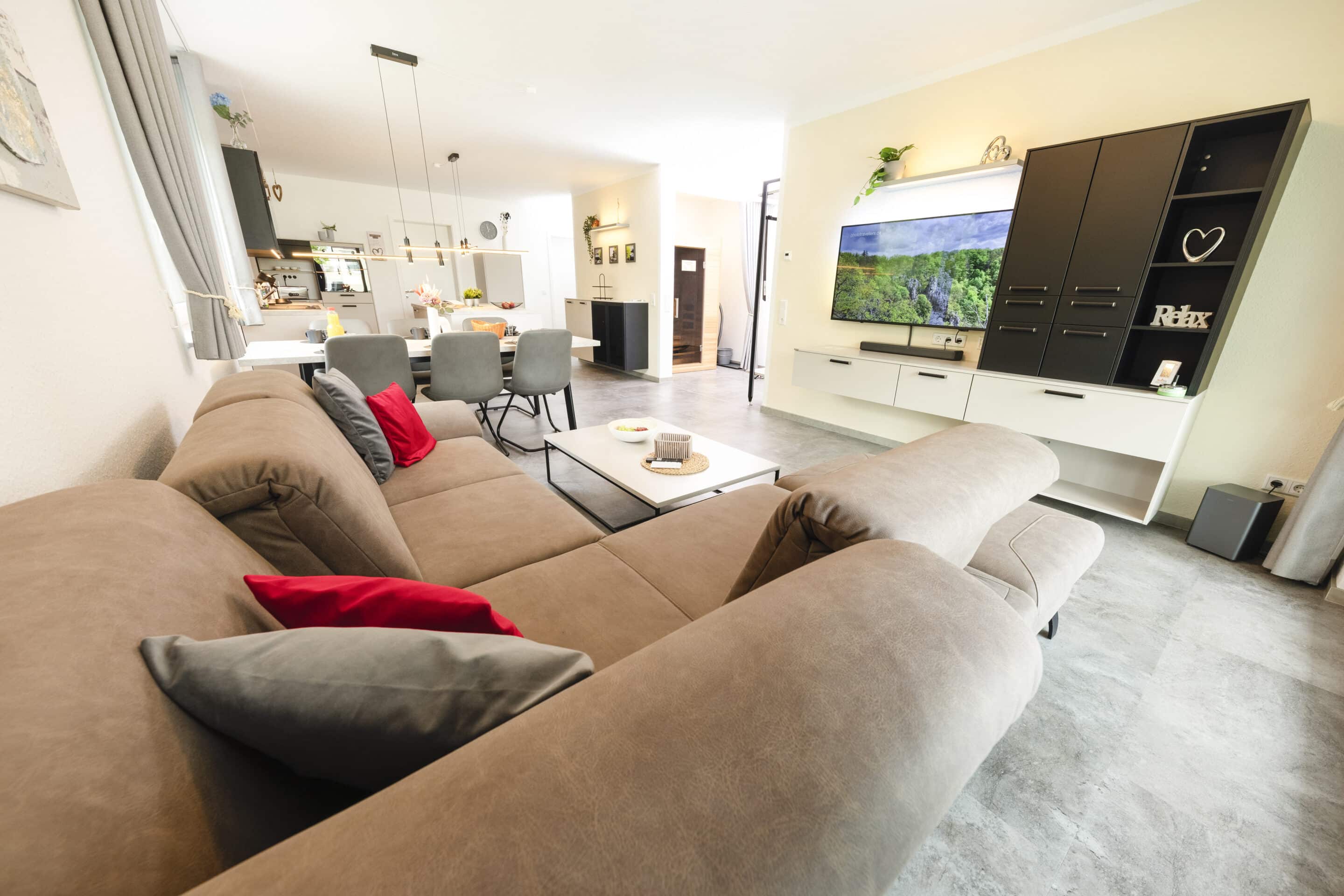 Entspannen Sie im komfortablen Wohnzimmer mit Flachbild-TV– perfekt für gemütliche Filmabende.