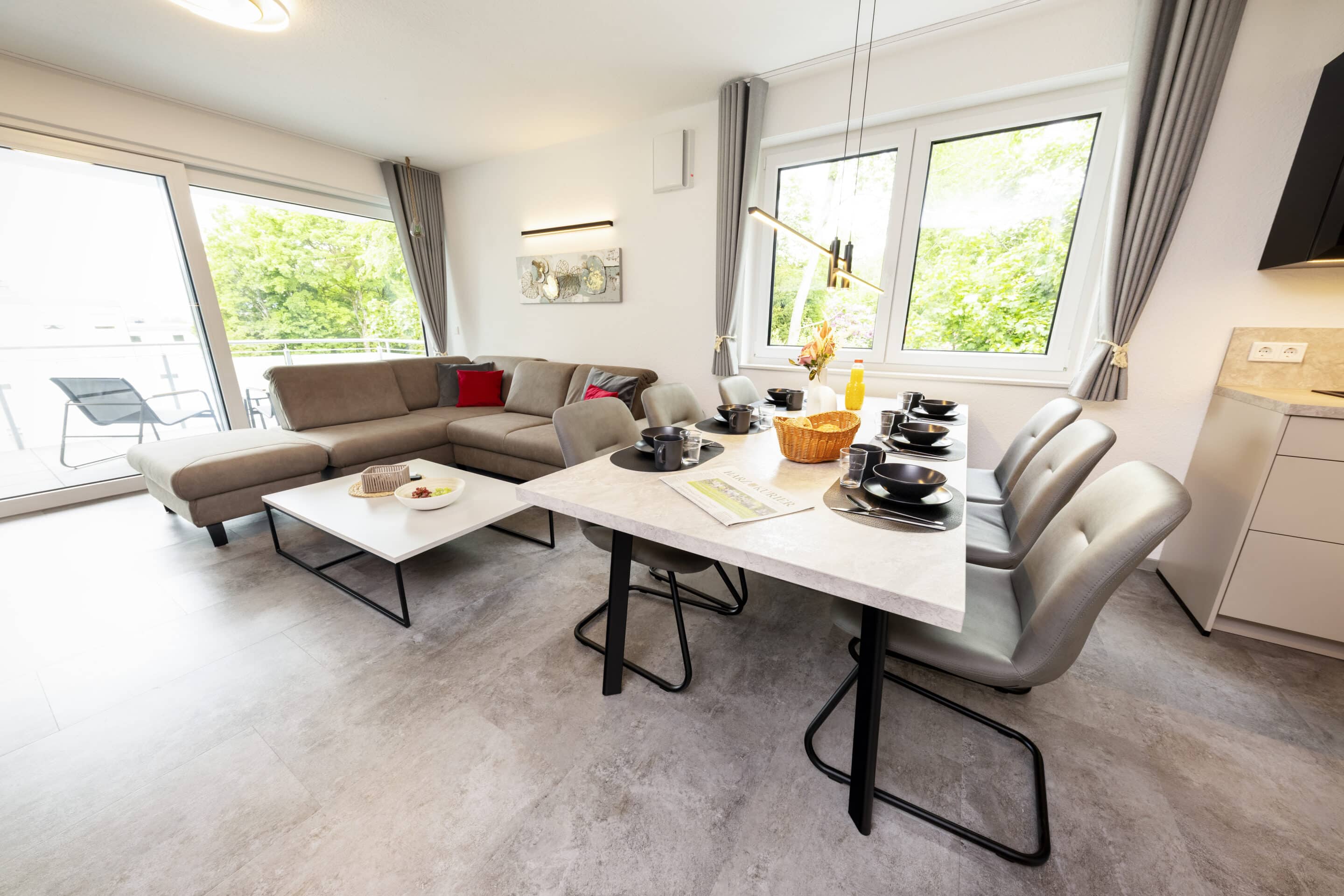 Das Appartment verfügt über vier Zimmer, in denen Sie Platz für bis zu sechs Personen finden. Darunter eine einladende Diele, ein Gäste-WC mit ebenerdiger Dusche, ein modernes Bad, ein Kinderzimmer sowie einen großzügigen Wohn- und Essbereich mit offener Küche, der mit ca. 41 m² viel Platz für gesellige Stunden bietet.